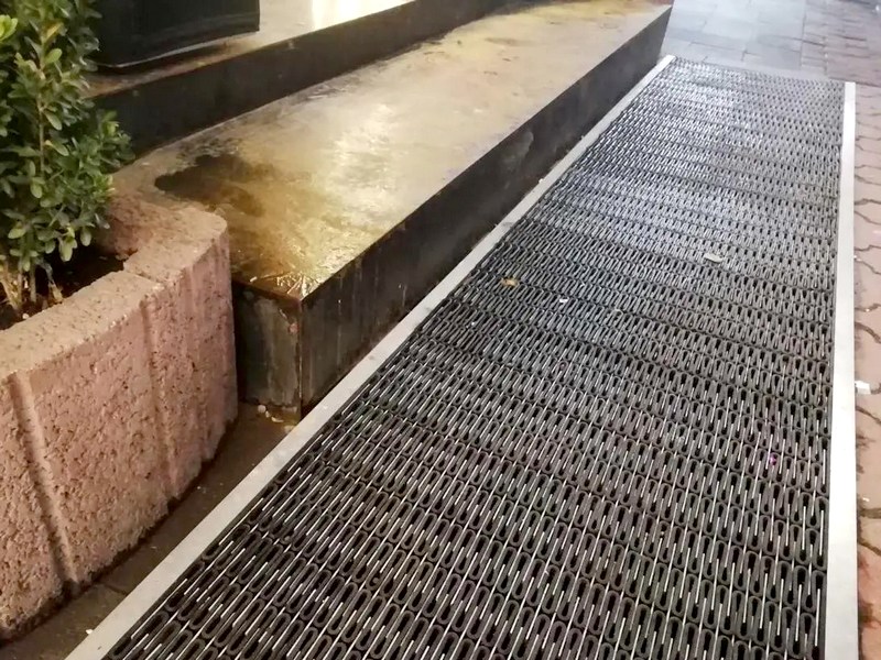 Встановлюється брудозахисні ґрати для входу на порозі. Мета будь-якої системи прибирання, це затримання рідини та бруду.